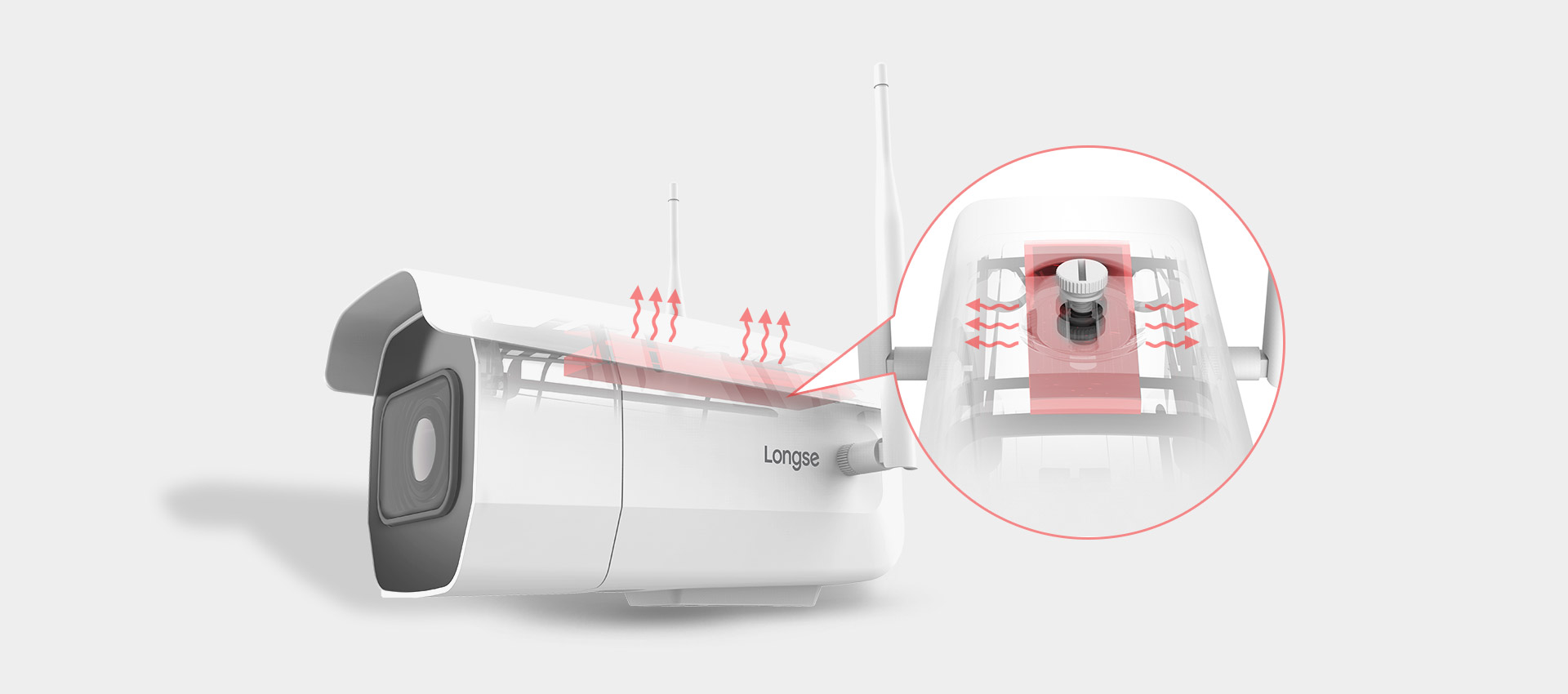 长视500万WIFI双天线收集摄像机的外部设想中,奇妙地接纳了散热设想,